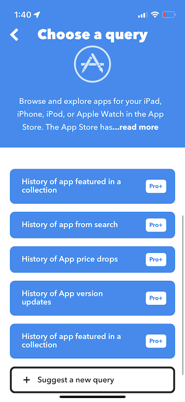 First up: If This Then That, IFTTT to friends. As a real Zapier girlie, I had the preconception of IFTTT as an earlier, less powerful Zapier. But Zapier doesn’t have a phone app, presumably because most of its revenue comes from B2B users more willing to accept computer-only software for work tasks. So IFTTT it was.