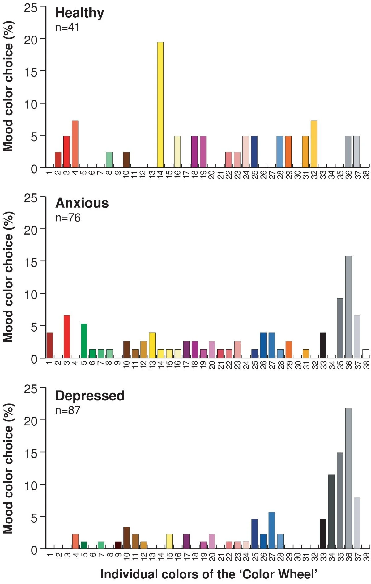In contrast, people who were anxious or depressed tended to pick greys as best representing their mood. And, interestingly, people who were depressed were more likely to choose desaturated colors (compare the color choices in the top and bottom graphs below).