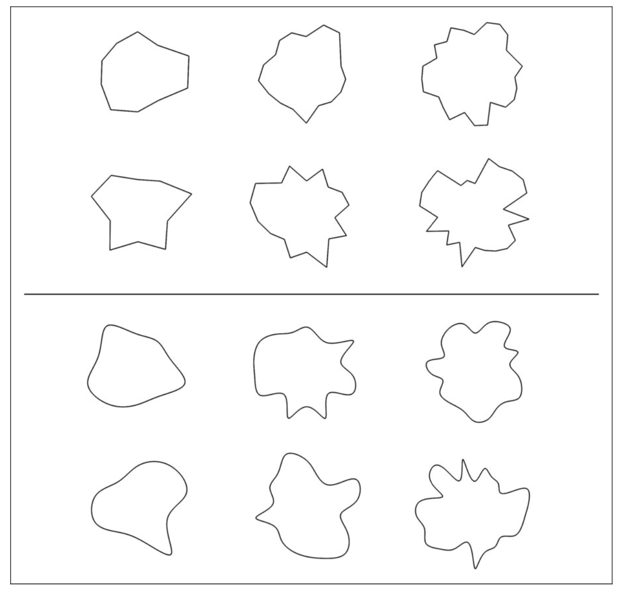 In this study, 119 college students viewed and rated shapes in two separate tasks. In one task, the shapes were irregular polygons. Half were angular and half were curved. After each shape, people rated how pleasant, interesting, and complex the image was.